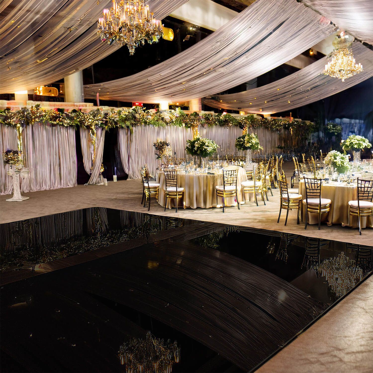 Add a touch of modern elegance to your indoor event with our high-gloss black dance floor. Sleek, stylish, and perfect for upscale celebrations. Available in a 16x16 setup.