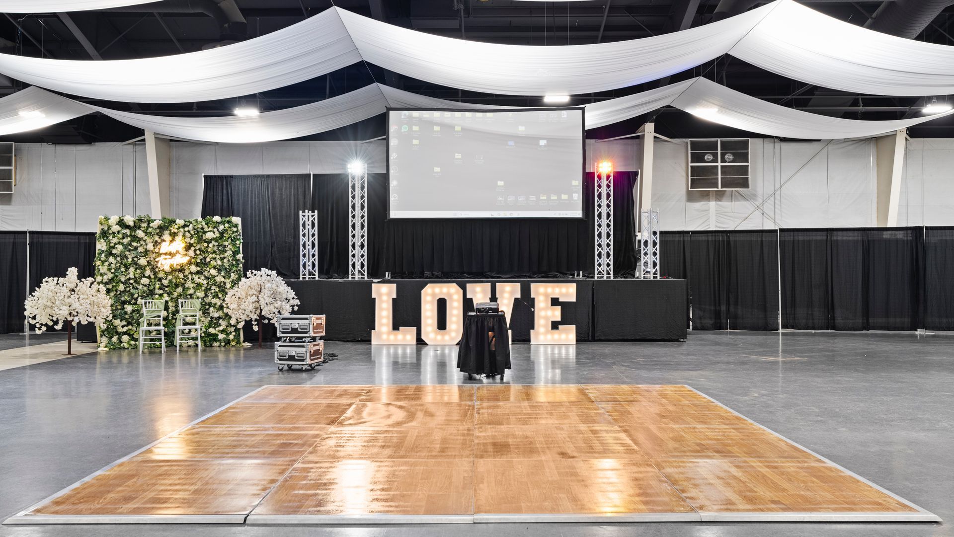 Add a touch of modern elegance to your indoor event with our high-gloss black dance floor. Sleek, stylish, and perfect for upscale celebrations. Available in a 16x16 setup.